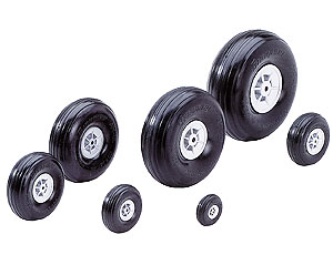 Ces roues sont particulièrement légères. Les semi-pneumatiques amortissent efficacement les chocs et sont indéformables. La surface des pneus et des jantes, lisse et brillante, est résistante aux carburants (même aux mélanges pour 2 temps, à base d'essence). La bande de roulement rainurée assure une trajectoire rectiligne au décollage et à l'atterrissage. Les jantes et les pneus sont d'un aspect réaliste. Roue env. Ø 50 mm
